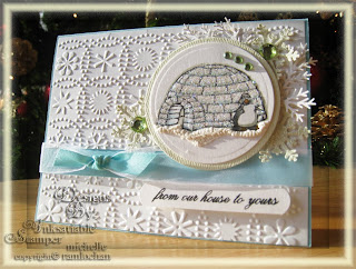 On to the card and to my regular readers :) I love this set that I used for this card. It is from Little Paper Shop also from the Global set just like from the previous card that posted. The Embossing folder used, I had never used before even though I got as soon as it was available....which was about a year ago maybe or even longer I'd think. Anyway, this card did in fact take alot of time to make but was a breeze when I massed produced them...the most difficult part was placing the winter leaves and then adding the glitter...